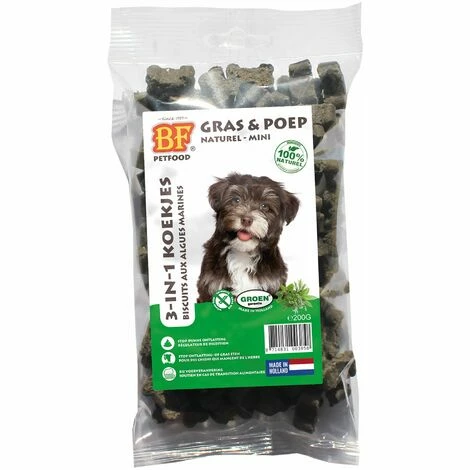 Votre chien mange de l’herbe ? alors ces biscuits 3 en 1 sont l’accompagnement idĂ©al afin d’aider sa digestion et son transit alimentaire.Ces friandises faibles en calories sont 100% naturelles et sans blĂ©.Convient Ă toutes les races de chien. Biscuits 3 en 1 aux algues marines BIOFOOD. Très faible en calories, riche en minĂ©raux et 100% naturel . BĂ©nĂ©fiques pour la digestion , soutien en cas de transition alimentaire . RĂ©gule le transit, notamment pour les chiens qui mangent de l’herbe ou leurs selles. Vous pouvez aussi utiliser ces biscuits en cas de transition alimentaire pour votre chien. Ils aideront son transit. Sans blĂ© Pour toutes les races de chiens, du chiot au senior. Conditionnement : 200 gr.