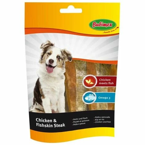 Gâtez votre chien avec ces délicieux biftecks composés de viande de poulet et de peau de cabillaud. Ces BUBIMEX Chicken and Fishskin Steaks sont particulièrement peu gras et contiennent naturellement beaucoup de protéines et d’oméga-3. Votre chien appréciera cette récompense.