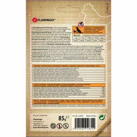 - composition: Poulet (78,8%), glycérine (8%), amidon (8%), sorbitol (3%), protéine végétale (2%), sel (0,2%).