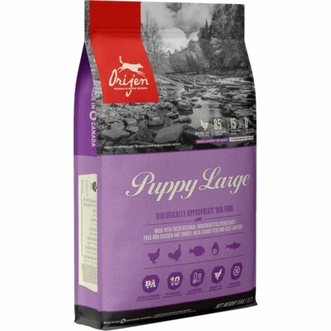 Adapté aux besoins physiologiques des chiots.RICHE EN PROTÉINES POUR ENCOURAGER LE DÉVELOPPEMENT D’UNE BONNE MASSE MUSCULAIRE CHEZ LES CHIOTS DE GRANDE RACE ET MOINS DE CALORIES POUR ASSURER UN POIDS SAIN ET RÉDUIRE LE STRESS SUR LES ARTICULATIONS ET OS EN PLEINE CROISSANCE.Avec 38 % de protéines nourrissantes et seulement 20 % de glucides à faible indice glycémique, ORIJEN nourrit les chiens de toutes les races et de tous les âges en fonction de leurs besoins biologiques.Aucune autre nourriture pour chiens ne se compare à Orijen : 2/3 de viandes FRAIS (réfrigérés sans agents de conservation) ou CRUS (surgelés sans agents de conservation), y compris les 10 premiers ingrédients.1/3 des viandes (comprenant poulet, dinde et poissons frais) est lentement déshydraté à 90ºC, ce qui procure une riche source de protéines nourrissantes pour soutenir la croissance de votre chiot.Les proportions WholePrey™ nourrissantes de viandes, d’abats et de cartilage frais, les poissons et œufs entiers frais procurent une source naturelle de pratiquement tous les nutriments dont votre chiot a besoin.Des infusions de foie lyophilisé de poulet et de dinde rehaussent la saveur naturellement. Même les chiots difficiles raffoleront de cette nourriture ORIJEN délicieuse et savoureuse. INGRÉDIENTS RÉGIONAUX :Viande de poulet fraîche (14%), viande de dinde fraîche (7%), oeufs entiers frais (7%), foie de poulet frais (6%), plie entière fraîche (5%), hareng entier frais (5%), foie de dinde frais (5%), cou de poulet frais (4%), coeur de poulet frais (4%), coeur de dinde frais (4%), poulet (déshydraté, 4%), dinde (déshydratée, 4%), maquereau entier (déshydraté, 4%), sardines entières (déshydratées, 4%), hareng entier (déshydraté, 4%), lentilles rouges, lentilles vertes, pois verts, fibre de lentilles, pois chiches, pois jaunes, haricots pinto, haricots ronds blancs, huile de hareng (1%), cartilage de poulet (1%), gras de poulet (1%), luzerne séchée au soleil, foie de poulet (lyophilisé), foie de dinde (lyophilisé), citrouille entière fraîche, courge musquée entière fraîche, courgettes entières fraîches, panais entiers frais, carottes fraîches, pommes red delicious entières fraîches, poires bartlett entières fraîches, chou vert frisé frais, épinards frais, feuilles de betteraves fraîches, feuilles de navet fraîches, varech brun, canneberges entières, bleuets entiers (myrtilles), baies de saskatoon entières, racine de chicorée, curcuma, chardon marie, racine de bardane, lavande, racine de guimauve, fruits de l’églantier. DISTRIBUTION DES CALORIES :Énergie métabolisable : 3720 kcal/kg (446 kcal pour une tasse de 250 mL/120 g). Répartition des calories pour maintenir une excellente forme : 41 % de protéines, 39 % de fruits et légumes et 20 % de matières grasses. COMPOSITION GARANTIE :Protéines brutes (min.) 38 %Matières grasses (min.) 16 %Cendres brutes (max.) 7 %Fibres brutes (max.) 6 %Humidité (max.) 12 %Calcium (min.) 1.3 %Phosphore (min.) 1.1 %Acides gras omega 6 (min.) 2.8 %Acides gras omega 3 (min.) 0.9 %ADH (min.) 0.3 %AEP (min.) 0.2 %Glucosamine (min.) 1400 mg/kgSulfate de chondroïtine 1200 mg/kg