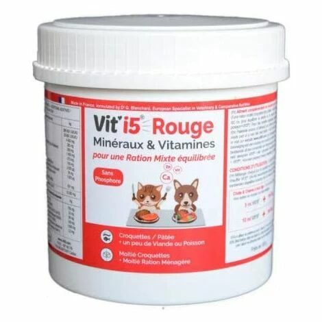 Vit’I5 Rouge pour Chien et Chat est un complément alimentaire pour une ration mixte équilibrée pour votre animal de compagnie.