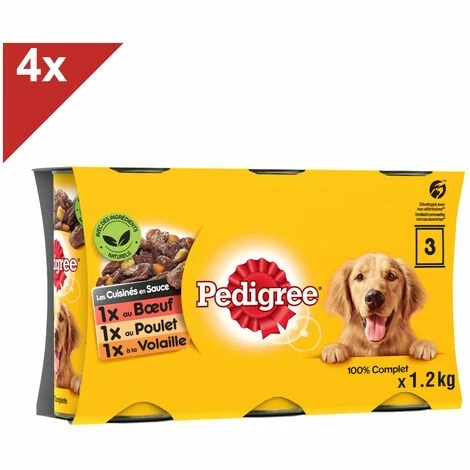 Aliment complet pour chiens adultes en sauce – 3 variétés (au Boeuf, aux Légumes et aux Pâtes / au Poulet et aux Légumes / à la Volaille et aux Carottes). Les boîtes PEDIGREE Les Cuisinés sont élaborées à partir d’ingrédients naturels* de qualité et couvrent tous les besoins des chiens. En plus d’être 100% complets et équilibrés, les repas PEDIGREE sont composés de fibres végétales pour une bonne digestion.