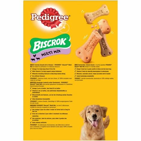 Aliment complémentaire pour chiens adultes. Les biscuits pour chien Pedigree Biscrok Original sont délicieusement croquants en forme d’os. Une récompense idéale pour tous les moments de jeu avec votre chien. Délicieuse friandise sans arômes artificiels. Avec des omega 3 pour l’aider à rester en forme tout au long de sa vie, des vitamines pour l’aider à préserver ses défenses naturelles et des minéraux, dont du calcium, pour l’aider à garder des os solides.