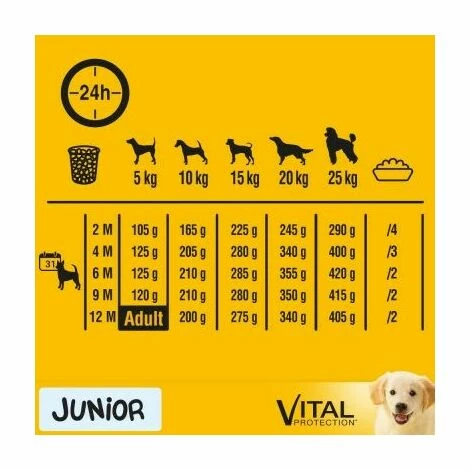 Les besoins nutritionnels des chiens varient en fonction de l’âge et de la race. C’est pourquoi il est important de leur donner une alimentation spécifique à leurs besoins. Développées avec nos nutritionnistes et nos vétérinaires du Centre de WALTHAM, les croquettes Pedigree Vital Protection sont élaborées pour couvrir nutritionnellement quatre besoins universels du chien; une alimentation pour chien qui aide à maintenir les défenses naturelles, favorise une peau et un pelage sains, contribue à une digestion optimale et à une bonne hygiène bucco-dentaire.