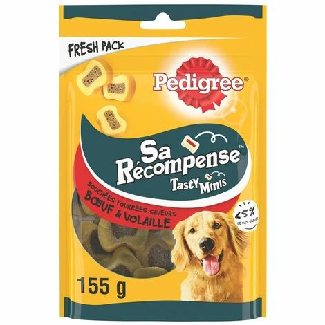 Aliment complémentaire pour chiens adultes. PEDIGREE® Sa Récompense Bouchées Fourrées saveurs boeuf et volaille, ce sont de savoureuses bouchées, avec une délicieuse texture pour mastiquer, parfaites pour faire plaisir à votre chien à tout moment de la journée ou le récompenser pendant les séances d’éducation ! Avec des omega 3 pour l’aider à rester en forme tout au long de sa vie, des vitamines E pour l’aider à préserver ses défenses naturelles et des minéraux, dont du calcium, pour l’aider à garder des os solides. Friandise sans colorant ni arôme artificiels, à moins de 5% de matières grasses / 100g.