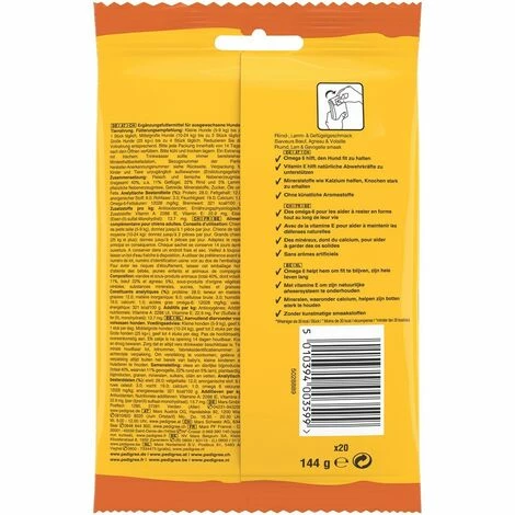 Aliment complémentaire pour chiens adultes – Multi Mix de Saveurs (Boeuf/Agneau/Volaille). Les friandises Pedigree ® Schmackos sont une excellente façon de récompenser votre chien ou simplement de lui montrer combien vous l’aimez. Délicieuses et tendres récompenses sans arômes artificiels et pleines de saveurs dont les chiens raffolent à moins de 30 calories par récompense. Avec des omega 6 pour l’aider à rester en forme tout au long de sa vie, des vitamines E pour l’aider à préserver ses défenses naturelles et des minéraux, dont du calcium, pour l’aider à garder des os solides.