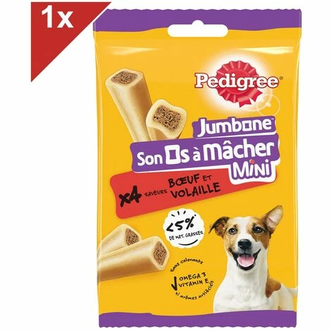 Aliment complémentaire pour chiens de petite taille <10kg (type Teckel) – aux saveurs Boeuf & Volaille. Les chiens adorent mastiquer. Pedigree® Son Os à Mâcher / Jumbone est l’os à mâcher idéal pour occuper et régaler votre chien. Faible en matières grasses*, ces friandises sont résistantes à l’extérieur, pour prolonger le plaisir de mâcher, et délicieusement fourrées pour une saveur incomparable. Avec des omégas 3 pour l’aider à rester en forme tout au long de sa vie. Des vitamines E pour l’aider à préserver ses défenses naturelles. Des minéraux, dont du calcium, pour l’aider à garder des os solides. Sans colorant ni arôme artificiels.
