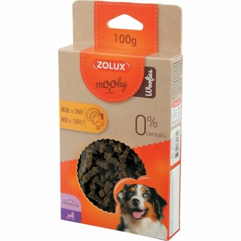 Partagez un moment de bonheur et de complicité avec votre compagnon grâce aux savoureuses friandises pour chien MOOKY.Gourmandes et attendrissantes, elles raviront ses papilles pour votre plus grand plaisir !Les friandises pour chien MOOKY Zolux premium sans céréales sont très riches en dinde. Avec leur teneur à 70% minimum en dinde, ces savoureuses friandises feront le régal de votre compagnon. Particulièrement saines pour la digestion, elles sont également sans céréales, sans conservateurs et sans sucres ajoutés. Pour un vrai plaisir partagé lors du dressage ou de vos sorties, récompensez votre animal et favorisez ainsi son bien-être.Vendues dans un étui en carton avec sachet refermable grâce à un sticker repositionnable, elles conserveront toute leur fraîcheur et resteront goûteuses pour le bonheur de votre chien.Caractéristiques des friandises pour chien Mooky Zolux premium à la dinde sans céréales : – Friandises fabriquées en Europe- A la dinde- En forme de petits os- Sachet refermable de 100gINGRÉDIENTS POUR FRIANDISE POUR CHIEN MOOKY PREMIUM À LA DINDE SANS CÉRÉALESAnalysesProtéines brutes 32.00%, Cellulose 2.00%, Matières grasses 6.00%, Cendres brutes 10.00%, Humidité 18.00%Ingrédients Viandes et sous-produits animaux (dinde minimum 70% issue de dinde déshydratée), sous-produits d’origine végétale, huiles et graisses, levures, lait et sous-produits laitiers